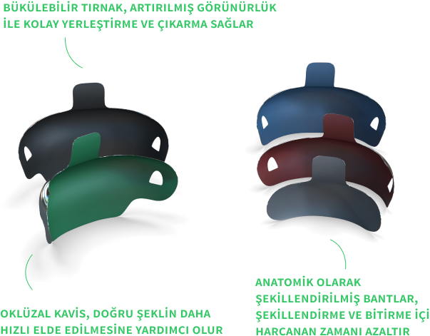 - Anatomik olarak şekillendirilmiş bantlar, şekillendirme ve bitirme için harcanan zamanı azaltır